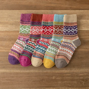 5 Pairs Large Pack Women's Socks Autumn Winter Snow Thick Heat Warm Folk Custom Retro Nordic Style Wool Socks Christmas Gift